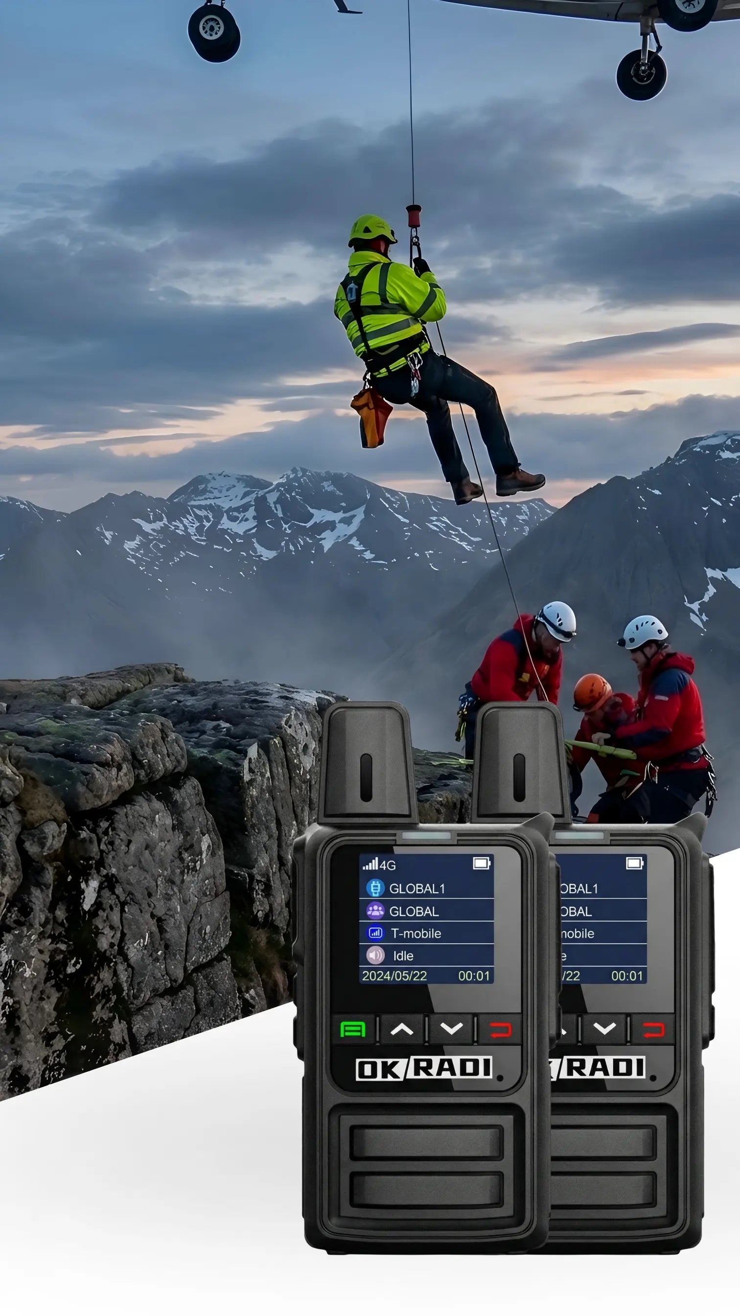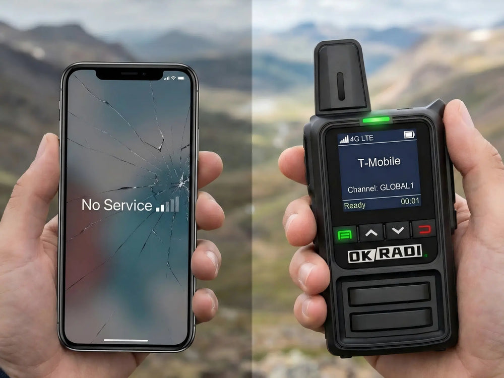 OKRADI devices work anywhere there is a 4G LTE/Cellular signal (AT&T/T-Mobile towers). They offer nationwide coverage, far exceeding standard walkie-talkies.